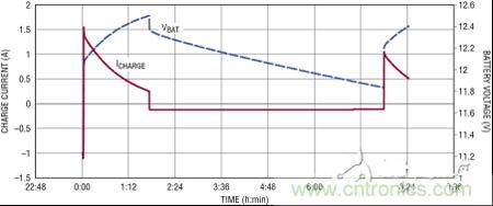 為了驗證電路功能,將一個數據記錄器連至充電器-電池系統。對電池電壓和電流進行采樣和存儲。為了方便電池的自放電并縮短放電時間,在電池端子之間連接一個 100Ω 電阻器。所產生的圖形如圖 3 所示。在周期一開始時,輸入電壓 VIN 被斷開,電池放電,并向負載提供“負”電流。然后,加上 VIN 后,充電周期啟動,“正”的充電電流流進電池。當電池充滿電以后,充電器關斷,電池開始自放電。當電池電壓達到最小值時,充電器接通,周期自我重復。