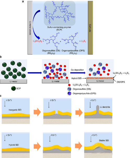 a) SCP提供電解質中的有機單元(多硫化物/多巨硫化合物)和無機單元(Li2S/Li2S2);