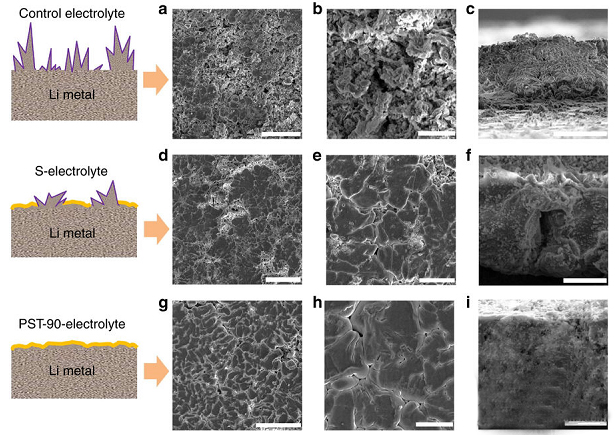 (g–i) 在PST-90的電解質中沉積在裸露的不銹鋼襯底上的金屬Li的SEM圖;