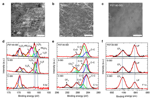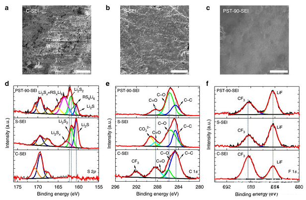 d)從不同電解質中形成的SEI膜的S 2p XPS光譜;