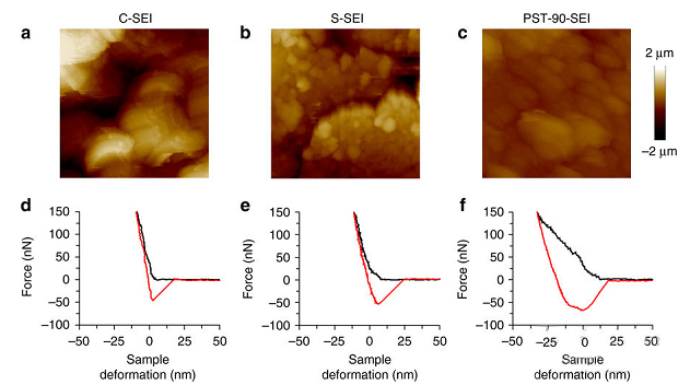 圖4. 由不同的電解質形成的SEI層的表面形態(tài)和機械性能