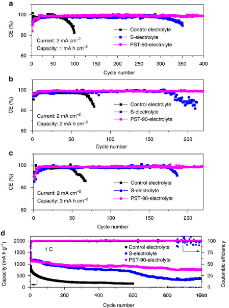 a)在2 mA cm-2的電流密度1 mA h cm-2的沉積能力下采用PST-90-電解質的電池循環(huán)性能;