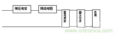 電路由降壓電容,限流,整流濾波和穩壓分流等電路組成。1.降壓電容:相當于普通穩壓電路中的降壓變壓器,直接接入交流電源回路中,幾乎承受全部的交流電源U,應選用無極性的金屬膜電容(METALLIZED POLYESTER FILM CAPACITOR)。2.限流電路:在合上電源的瞬間,有可能是U的正或負半周的峰_峰值,此時瞬間電流會很大,因此在回路中需串聯一個限流電阻,以保證電路的安全。3.整流濾波:有半波整流和全波整流,與普通的直流穩壓電源電路的設計要求相同。4.穩壓分流:電壓降壓回路中,電流有效值I是穩定的,不受負載電流大小變化的影響,因此在穩壓電路中,要有分流回路,以響應負載電流的大小變化。