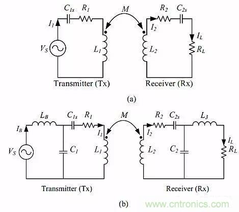 圖1:無線輸電(WPT)設計中所用補償電路拓撲有四種,這里是其中兩種:(a)SS拓撲,(b)LCL-LCL拓撲。