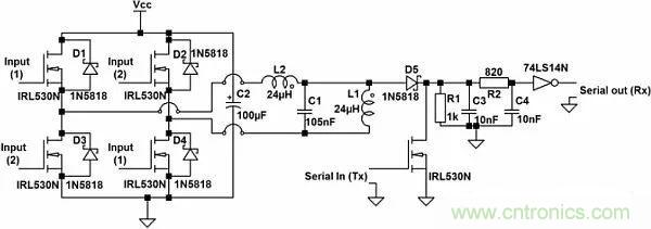 現在雙向輸電電路可以基于LCL逆變器來構建,其中,兩個反相方波分別輸入到四MOSFET逆變器的1號和2號輸入端,見圖4。