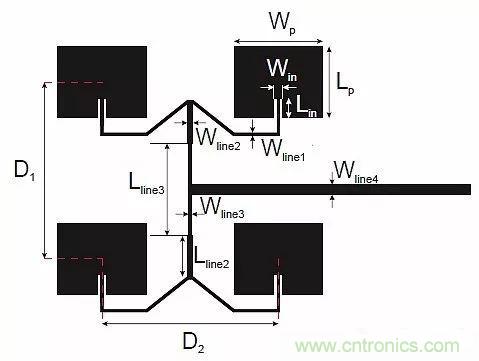 天線采用平面2x2貼片陣列設計,4個貼片通過一個帶3個T型結點的公共饋電網絡連接,這3個T型結點都在同一層上,作為50Ω的輸入饋線,見圖7。