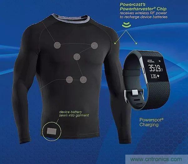 可穿戴設備設計人員可以將Powercast公司的Powerharvester IC嵌入到可穿戴設備中,為一個或多個設備提供一定距離的無線充電。通過收集ISM頻段的射頻能量,這種IC可以向可穿戴設備的電池提供涓流充電。這種方法支持可水洗的密封設備。
