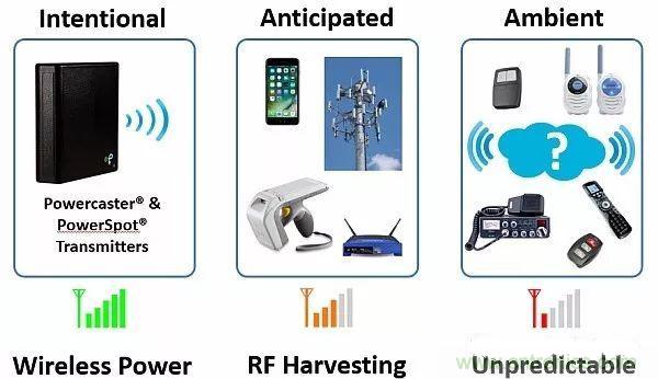 在壁櫥或梳妝臺抽屜中可以安裝類似手機發射器的小功率射頻發射器。這種發射器可以為可穿戴服裝提供充電區域。不管可穿戴設備是在壁櫥里還是在抽屜里,這些設備的電池都能自動接收涓流充電。這種方法與接收器需要依賴一定頻率范圍內的隨機射頻信號的場景不相干。圖9給出了射頻電源種類。