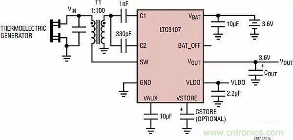 凌力爾特公司有一種基于LTC3107的能量采集解決方案,可用于給無線系統網絡和充電電池進行供電,見圖16。