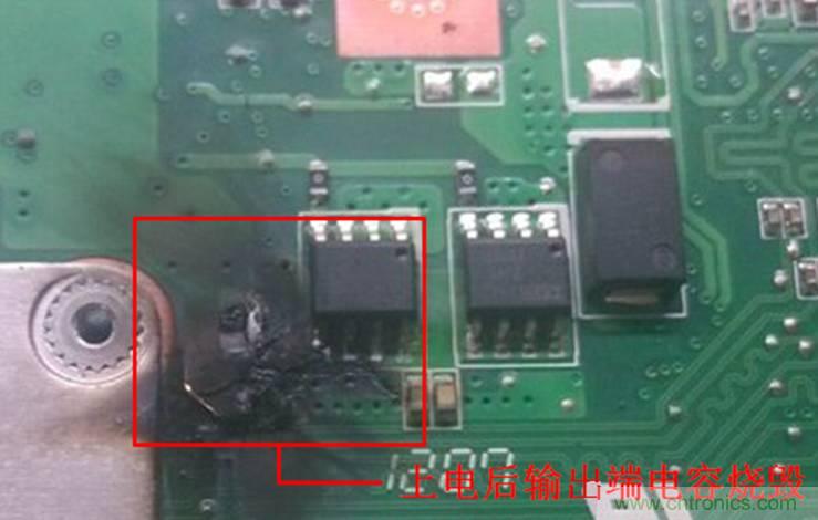 較于上一種電源模塊損壞的情況而言,更可怕的情況就是,不僅壞了電源甚至把整個電路都燒毀了。具體的現(xiàn)象就是電源模塊剛上電就燒毀冒煙了,輸入端的電容炸裂,如圖3所示,這一類問題是最為嚴(yán)重的,需要在前期設(shè)計(jì)中盡量避免,那么若是已經(jīng)發(fā)生了這一情況,它到底是什么原因?qū)е碌哪兀烤唧w如下所示: