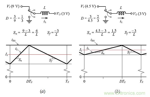 圖3所示電路存在兩個缺陷。第一個缺陷如圖5所示,是將VO調節為3.0V的轉換器設計(為簡單起見,假設周期在t = 0時開始)。圖4a示出了在VI=9V條件下,穩態電感器電流iL和其平均值IL,對應于D = 3/9 = 1/3的占空比。假設現在VI下降到4.5V,則對應D = 3 / 4.5 = 2/3的占空比。假設vEA沒時間發生顯著變化,那么平均電感器電流iL將增加,如圖5b所示。這是因為當下坡Sf在-3/L保持恒定時,上坡Sn從(9-3)/L減小到(4.5-3)/L,即從6/L減少到1.5/L。