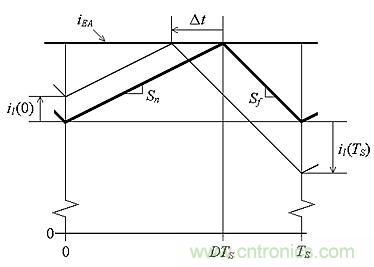 第二個缺陷是稱為次諧波振蕩的不穩定形式,當D>0.5時會產生這種不穩定。圖6顯示了周期開始時電感電流擾動il(0)如何在周期結束時演化為擾動il(TS)。例如,擾動可能由前一周期中比較器失能引起。借助簡單的幾何,我們可以得出il(0)/△t = Sn和il(TS)/△t = Sf。消除△t,得出:
