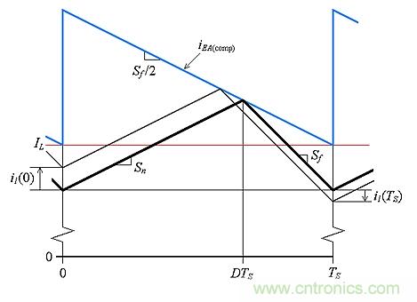 這樣,我們僅以電流形式就可以顯示一個周期,如圖4所示?,F在,復位觸發器打開Mp開關,同時關閉Mn開關,使vSW= 0。在表示為(1–D)TS的周期其余部分,我們有vL=0–VO,所以iL以Sf的斜率下降,因此有:
