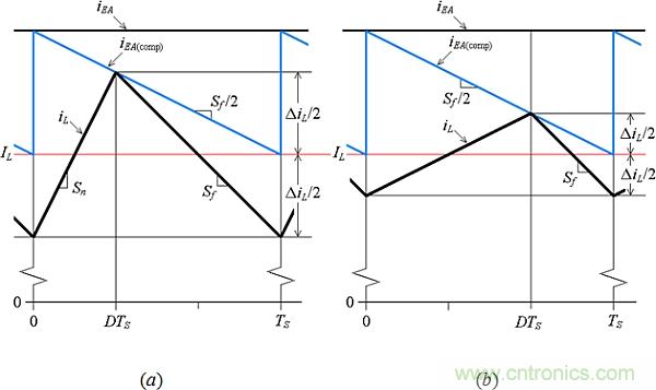 圖9給出了修改圖3的電路以實現斜率補償的一種方法。該電路現在包含一個以fS頻率工作的鋸齒波發生器,從vEA中減去其輸出vRAMP,產生iL所期望的峰值軌跡。使用斜率補償,圖5的波形如圖10所示變化,其中iEA(comp) = (vEA– vRAMP)/Ri。