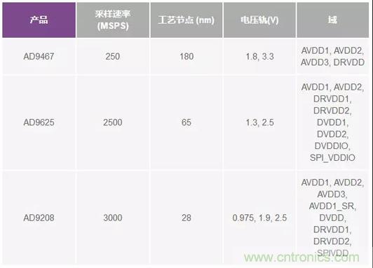 數(shù)字電路不需要裕量,因?yàn)樽钪匾膮?shù)是速度。所以,數(shù)字電路通常以最低電源電壓運(yùn)行,以獲取CMOS開關(guān)速度和功耗的優(yōu)勢(shì)。這在新一代ADC中很明顯,最低電壓軌已降低至0.975 V。下面的表1列出了若干代的一些常見ADC。