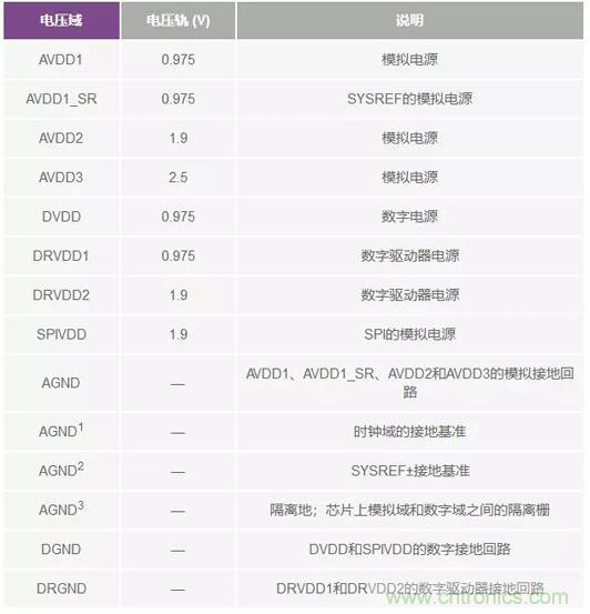 為了改善隔離,設(shè)計(jì)者必須考慮各種耦合機(jī)制。最明顯的機(jī)制是通過共享電源域。如果電源域盡可能遠(yuǎn)離電路,那么共享同一電壓軌(AD9208為0.975 V)的數(shù)字電路和模擬電路發(fā)生震顫的可能性將非常小。在硅片中,電源已被分開,接地也是如此。封裝設(shè)計(jì)繼續(xù)貫徹了這種隔離電源域處理。由此所得的同一封裝內(nèi)不同電源域和地的劃分,如表2所示,其以AD9208為例。
