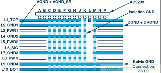 通過充分濾波和布局分離,各個(gè)域可以合理布置,使得ADC性能最大化,同時(shí)降低BOM和PDN復(fù)雜性。各接地域采用開爾文連接方法也會(huì)改善隔離。從網(wǎng)表角度來看,仍然只有一個(gè)GND網(wǎng)。電路板可以劃分為不同接地域以提供充分的隔離。在AD9208的評(píng)估板AD9208-3000EBZ中,不同接地分區(qū)在第9層上形成開爾文連接。圖4所示為10層PCB(印刷電路板)AD9208-3000EBZ的橫截面,其顯示了不同GND連接。