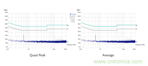 圖 12:MAX17502 EMI 評(píng)估板傳導(dǎo) EMI 測試結(jié)果。左:準(zhǔn)峰值;右:平均值。