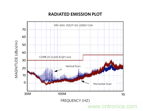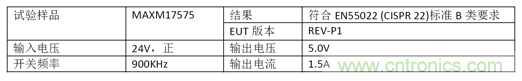 MAXM17575 本質(zhì)上具有極低的輻射 EMI。對(duì)于輻射測試,傳導(dǎo) EMI 測試中所示的輸入濾波器不需要也沒有使用。使用輸入濾波器能夠?yàn)檩椛錅y試提供更大的裕量。
