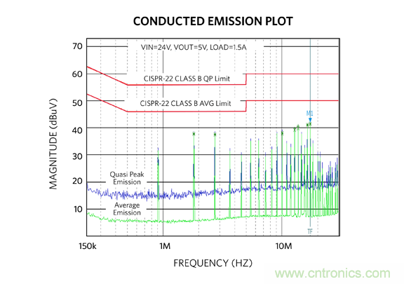 圖 15:MAXM17575 評(píng)估板傳導(dǎo) EMI 測試結(jié)果。藍(lán)色:準(zhǔn)峰值;綠色:平均值