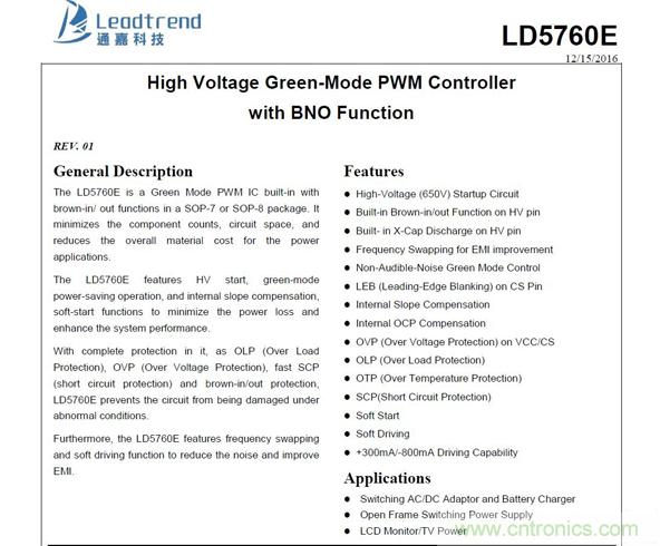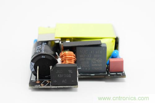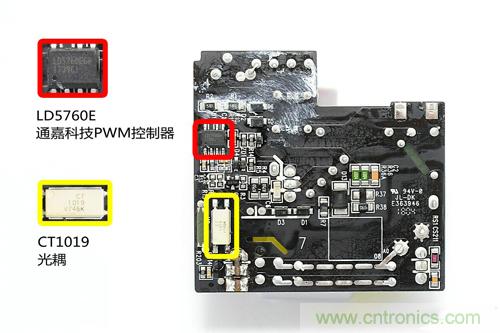 由于沒有使用SR技術(shù),PCB背面元器件較少,主要是位于左上的 LD5760E,來自通嘉科技的PWM控制器,與前述的東芝TK10A60W組成一次側(cè)電路。左下方的白色器件為CT1019光耦,用于電壓反饋。