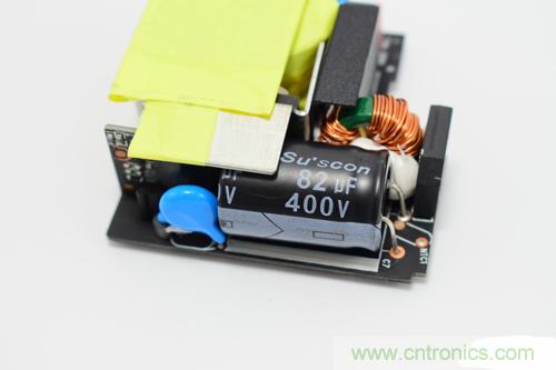全橋整流后的一次側(cè)濾波電源為一枚82μF/400V 電容,來自SUSCON(臺灣冠坤)。從此角度看,屬于保護(hù)電路的NTC空缺未安裝。