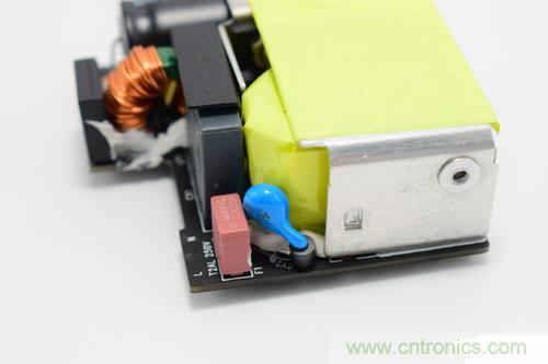 保險旁是藍(lán)色的Y電容,腳上套有磁環(huán)。