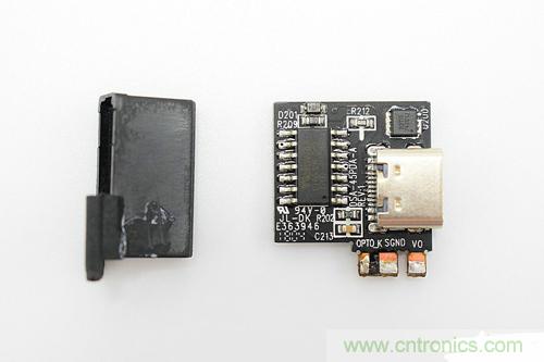Type-C輸出為獨立的一塊PCB小板,小板尾部有塑膠封套,用于絕緣和定位。