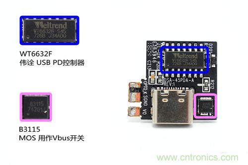 14腳IC為 Weltrend偉詮WT6632F ,來自偉詮的 USB PD控制器,同時支持QC2.0和QC3.0協(xié)議。粉色框內(nèi)是絲印為 B3115 的貼片MOSFET,用于Vbus開關(guān)。