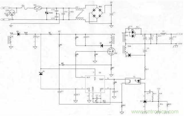 因?yàn)檩敵鰹?.3V,而TL431的Vref值為2.5V,若再加上photo coupler上的壓降約1.2V,將使得輸出電壓無法推動(dòng)Photo coupler及TL431,所以必須另外增加一組線圈提供回授路徑所需的電壓。