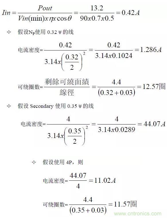 當(dāng)變壓器決定后,變壓器的Bobbin即可決定,依據(jù)Bobbin的槽寬,可決定變壓器的線徑及線數(shù),亦可計(jì)算出線徑的電流密度,電流密度一般以6A/mm2為參考,電流密度對變壓器的設(shè)計(jì)而言,只能當(dāng)做參考值,最終應(yīng)以溫升記錄為準(zhǔn)。
