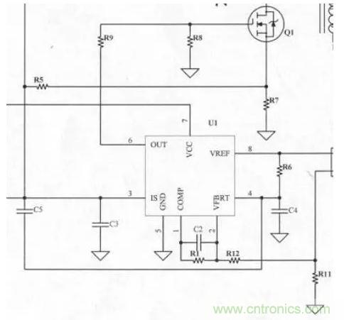 R9電阻的大小,會(huì)影響到EMI及溫升特性,一般而言阻值大,Q1 turn on / turn off的速度較慢,EMI特性較好,但Q1的溫升較高、效率較低(主要是因?yàn)閠urn off速度較慢);若阻值較小, Q1 turn on / turn off的速度較快,Q1溫升較低、效率較高,但EMI較差,一般使用51Ω-150Ω 1/8W。