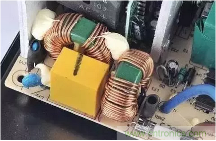 一級EMI濾波電路位于電源接口處,做工更好的電路還具有獨立PCB板和電感線圈。