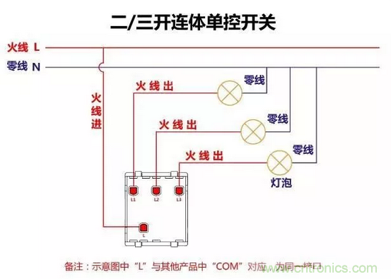 二三開連體單控開關(guān)接線圖