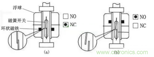圖(a):當水位下降時,環狀磁鐵下降,磁簧開關處于接通狀態;