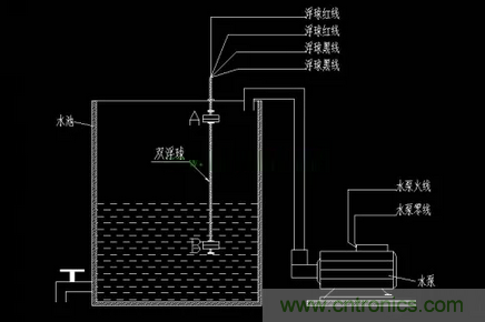 2、當水位漲到A、B處限位開關之間時,B處開關斷開,A處開關仍然是閉合狀態,此時線圈被自鎖得電,水泵繼續運行;