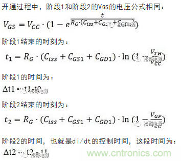米勒平臺區這個階段的時間也就是dV/dt的時間,柵極電壓恒定,流過柵極電阻RG的電流等于流過電容CGD1的電流。根據系統要求的輸出電壓的上電時間Ton、輸出電壓Vo、CGD1、VCC和VGP已知,由下面公式計算G極串聯總電阻RG:
