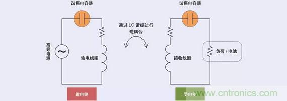 磁共振式是在輸電側(cè)與受電側(cè)分別插入電容器,形成LC諧振電路,并使輸電側(cè)與受電側(cè)諧振頻率一致,從而進行電力傳輸?shù)姆绞健F涮攸c在于即使線圈間的距離多少會出現(xiàn)擴大,或偏離中心位置的情況等在耦合系數(shù)較低的狀態(tài)下也能實現(xiàn)高傳輸效率。其基本原理如圖1所示。