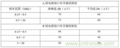 開關電源的傳導騷擾是通過電源的輸入電源線向外傳播的電磁干擾。在開關電源輸入電源線中向外傳播的騷擾,既有差模騷擾、又有共模騷擾,共模騷擾比差模騷擾產生更強的輻射騷擾。傳導騷擾的測試頻率范圍為150KHz~30MHz,限值要求如下表1 所示: