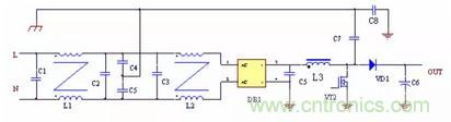 圖2 中,在PFC 升壓電感上增加一個輔助繞組,該繞組的匝數與主繞組相同,方向與主繞組相反,C7 是開關管與散熱器之間的耦合電容,如圖所示增加一個與C7 容量大致相同的一個電容接到散熱器與輔助繞組之間,這樣C7、C8 耦合到散熱器的騷擾信號幅度相同,方向相反,兩個信號剛好可以相互抵消,大大減小向外發射的騷擾電平。
