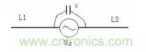 圖中,Vs 為騷擾源,對圖4 來說,就是開關管VT2 的D 極,L1、L2 相當于天線的兩個極,一個極是與開關管D 極相連的印制線,另外一個極是散熱器及與之相連的接地線,C是天線兩極之間的耦合電容,即圖4 中開關管與散熱器之間的耦合電容。
