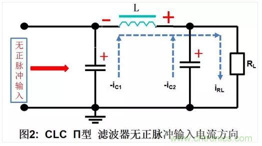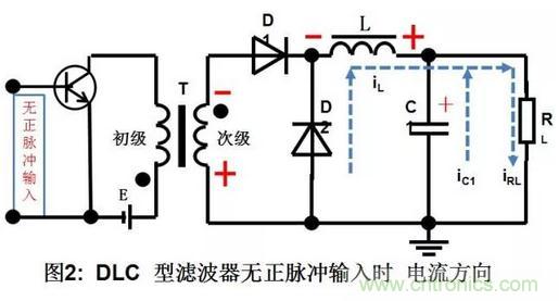b. 輸入正脈沖消失,負(fù)載RL的電流由兩路提供,一路是C2放電提供的電流為-ic2,,另一路是由電感L儲存的磁能轉(zhuǎn)換成電能,并與C1上的電壓串聯(lián)后提供-ic1。負(fù)載RL中的電流等于兩個電容器放電電流的和,即IL= -(ic2+ic1)