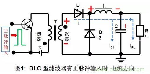 a.輸入正脈沖時,先給C1充電,充電電流為ic1,迅速充到脈沖的峰值電壓Vi,同時電感器L中也有線性增長的電流,并在L中儲存了磁能,隨著電流的增長,儲存的磁能越來越多,電容器C2通過電感L也充上了電壓,充電電流為ic2,C2和C1上的電壓基本相等,負(fù)載RL中的電流IRL也是由輸入脈沖供給。