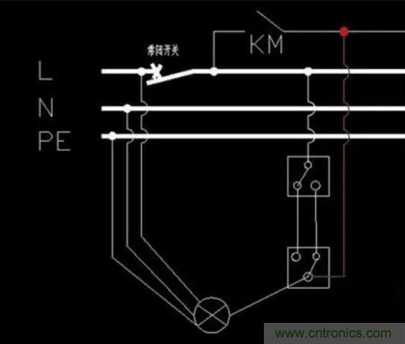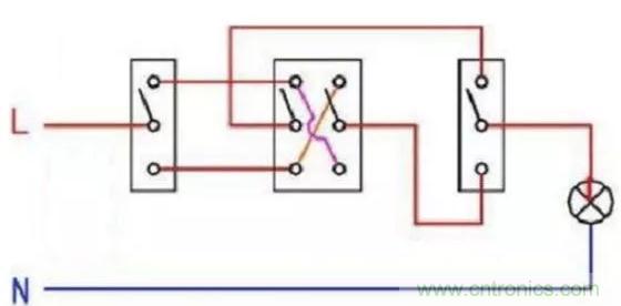 把兩個單刀雙擲開關(guān)的兩個觸點分別相連,即開關(guān)1的觸點1與開關(guān)2的觸點1相連,開關(guān)1的觸點2與開關(guān)2的觸點2相連,然后兩個開關(guān)的刀做為整個開關(guān)的兩端接入電燈的兩端。這樣當(dāng)開關(guān)1和2的刀同時接打向各自觸點1或同時打向觸點2時,電路接通,則燈亮。若兩開關(guān)的刀一個打向觸點1而另一個打向觸點2時,電路不通,則燈滅。因此兩個開關(guān)都可以控制燈。兩個開關(guān)可以放在樓梯的上下兩端,或走廊的兩端,這樣可以在進(jìn)入走廊前開燈,通過走廊后在另一端關(guān)燈,既能照明,又能避免人走燈不滅而浪費電。