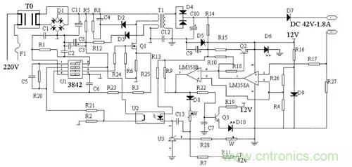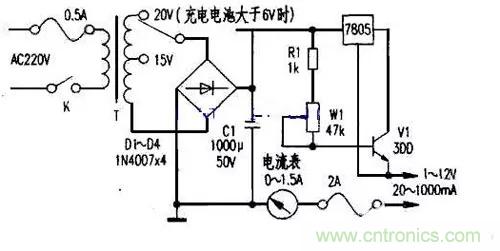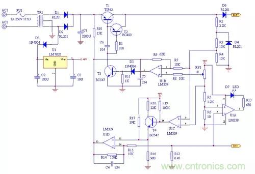 本電路設有反極性保護電路,由D4,U,U1D,T1及外圍元件構(gòu)成,當電池反接時,充電器限制輸出電流不致發(fā)生事故。充電指示由U,D7及外圍元件構(gòu)成,充電時,D7點亮,充電器進入浮充狀態(tài)后,D7熄滅,表示充電結(jié)束。