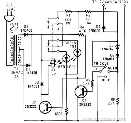 不管是一個低電流(50毫安),還是高電流(1安培),該電路都有能力提供。你可以選擇手動充電或者自動模式。當電流很低的時候,你可以在選擇高電流充電之前先用低電流。如果電池的電壓過低,齊納二極管D5將有足夠的電流來產(chǎn)生一個穿過R6的電壓從而使得Q2開啟。