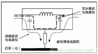 許多設備的電源線進入機箱后,經過很長的導線才接到濾波器的輸入端。例如,電源線從機箱后面板輸入,走行到前面板的電源開關,又回到后面板接到濾波器。或者濾波器的安裝位置距離電源線入口較遠,造成引線太長(如圖1所示)。