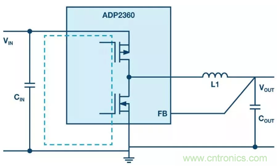 圖1:用于降壓轉(zhuǎn)換的開關(guān)穩(wěn)壓器(帶如虛線所示的關(guān)鍵熱回路)。