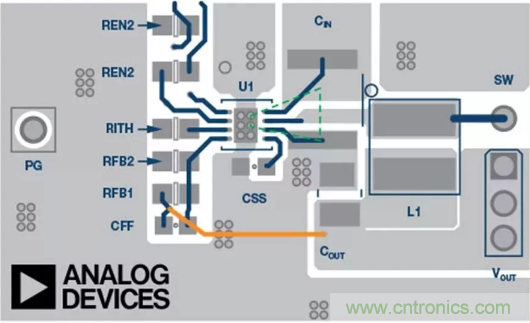 圖2所示為ADP2360的示例布局。在本圖中,圖1中的重要熱回路標(biāo)為綠色。從圖中可見,黃色反饋路徑離線圈L1有一定距離。它位于PCB的內(nèi)層。