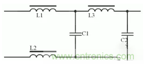 圖5是開關電源的直流輸出側濾波電路,它由共模扼流圈L1、L2,扼流圈L3和電容C1、C2組成。為了防止磁芯在較大的磁場強度下飽和而使扼流圈失去作用,磁芯必須采用高頻特性好且飽和磁場強度大的恒μ磁芯。